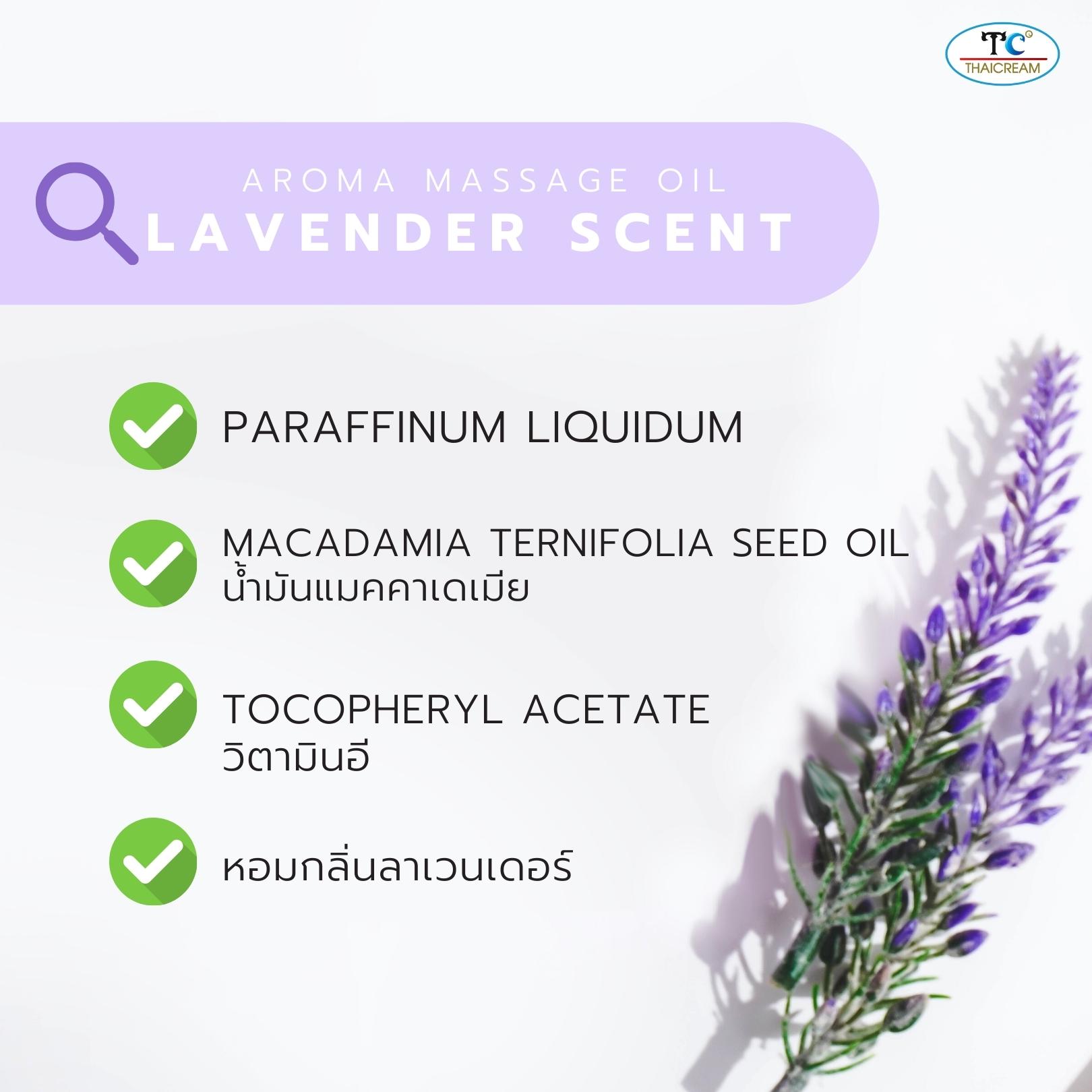 Aroma Massage Oil with a gentle lavender scent designed for professional body massage. Its lightweight texture glides smoothly and absorbs easily without leaving a greasy residue. Enriched with Macadamia Oil and Vitamin E to help moisturize and soften the skin. Suitable for spa treatments or daily body care.