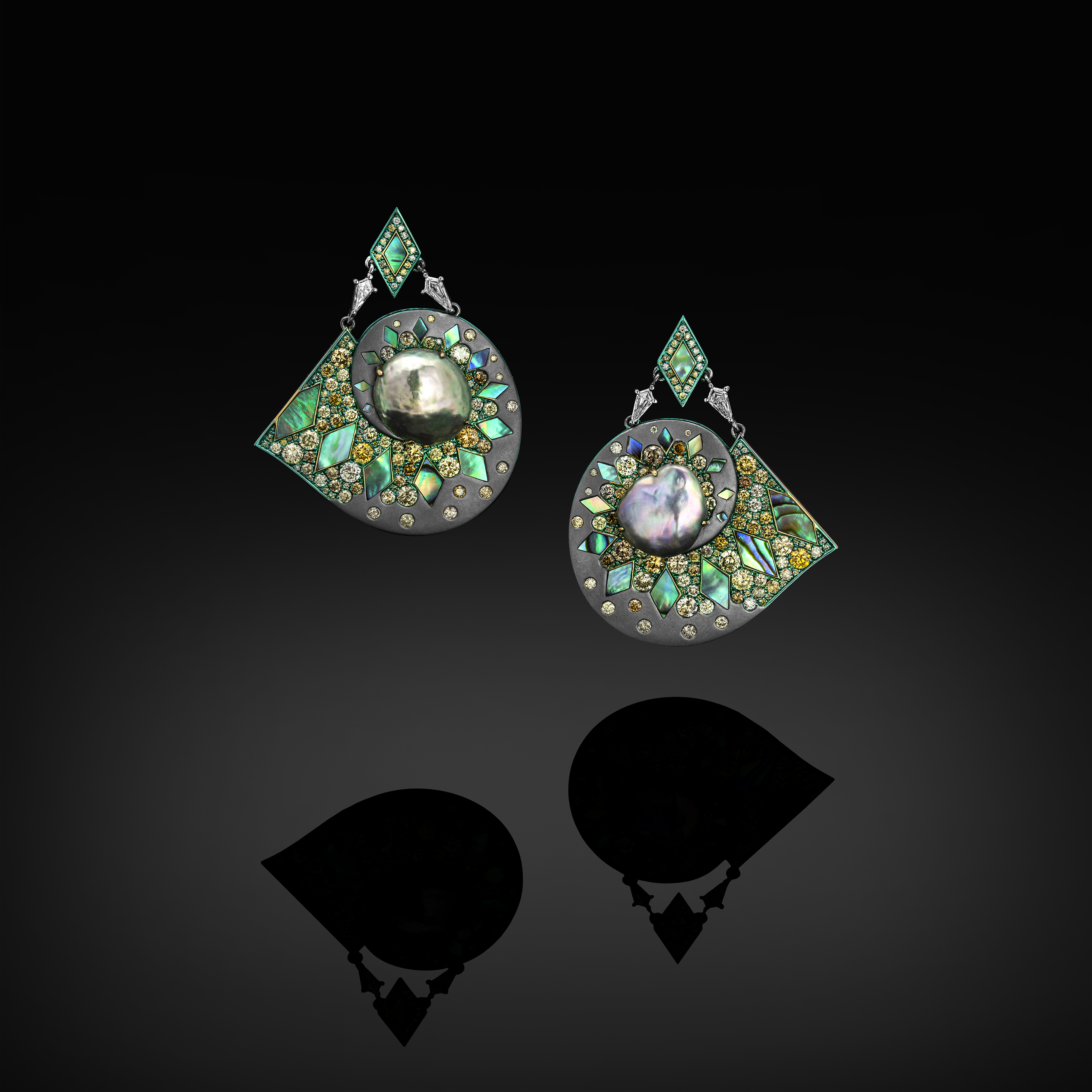 18K White Gold, Abalone Shell, Fancy Color Diamond, White Diamond, Natural Pearl