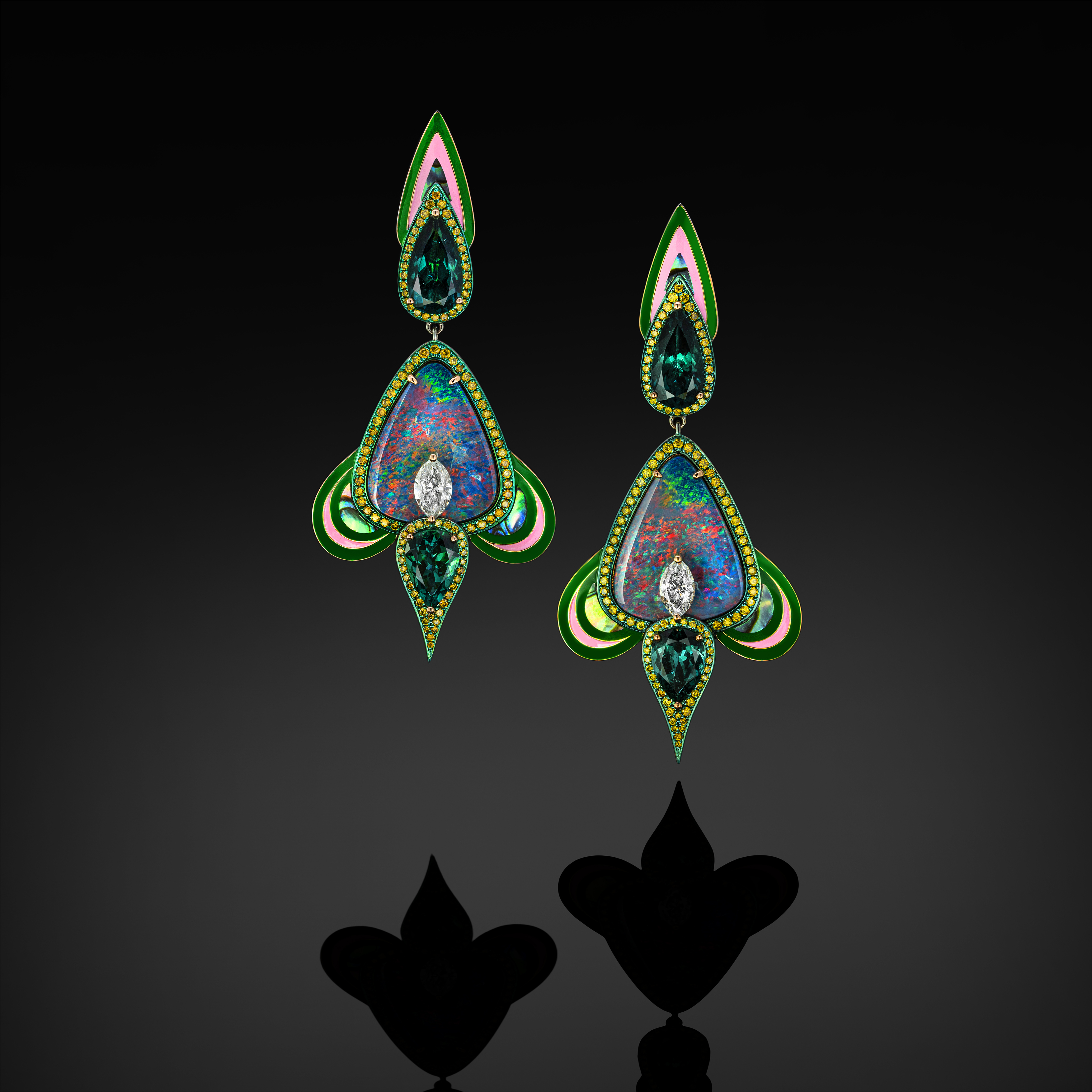 18K Rose Gold , Abalone Shell, Color Diamond, White Diamond, Blue Tourmaline, Opal