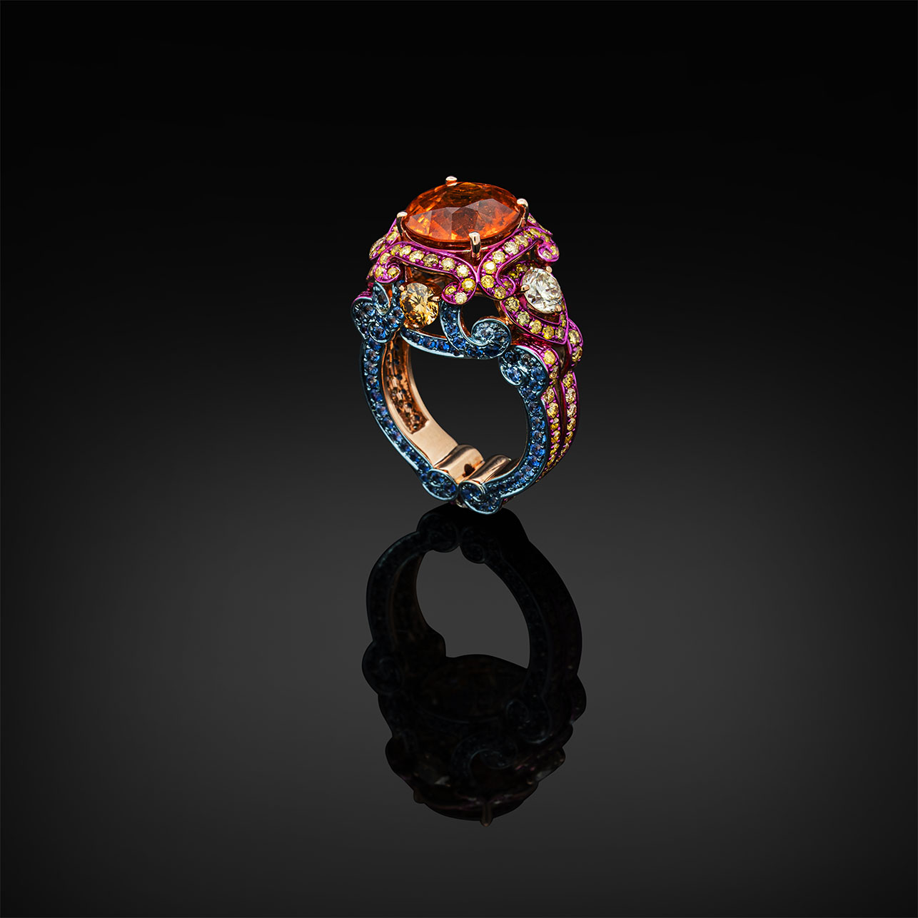 18K Rose Gold, Sapphire, Color Diamond, Spessartite Garnet