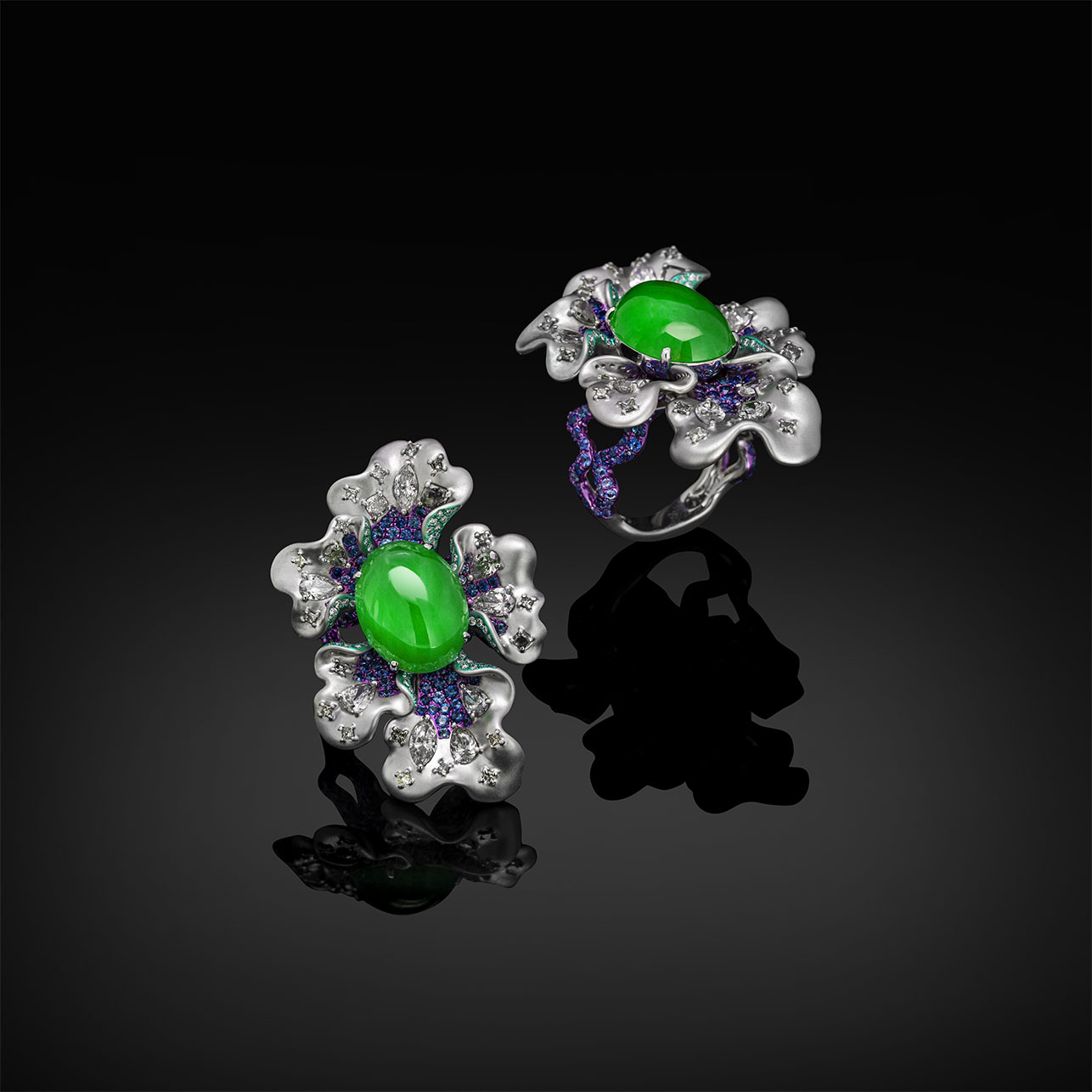 18K White Gold, Sapphire, White Diamond, Color Diamond, Green Jade