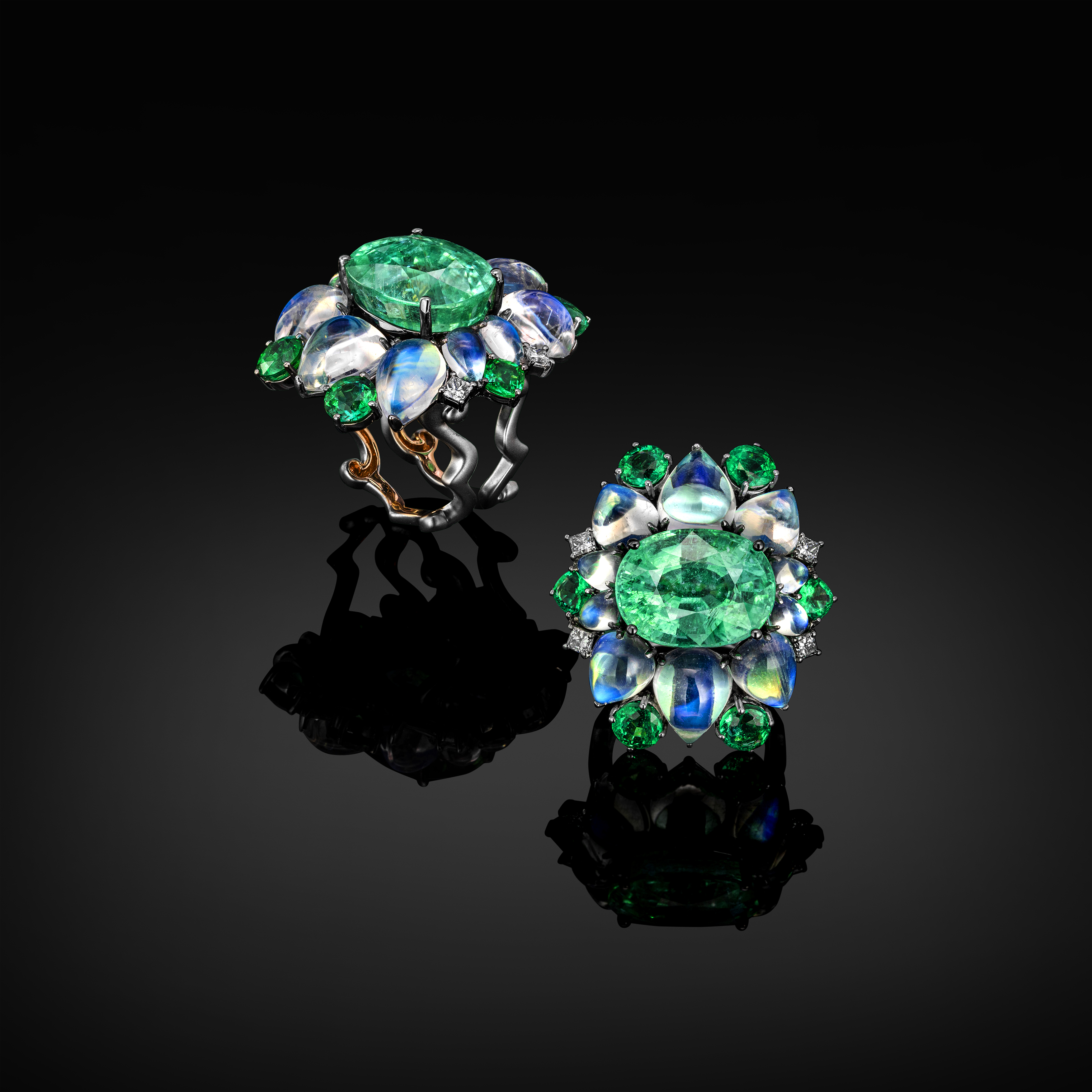 18K Rose Gold, White Diamond, Moonstone, Emerald, Paraiba Tourmaline