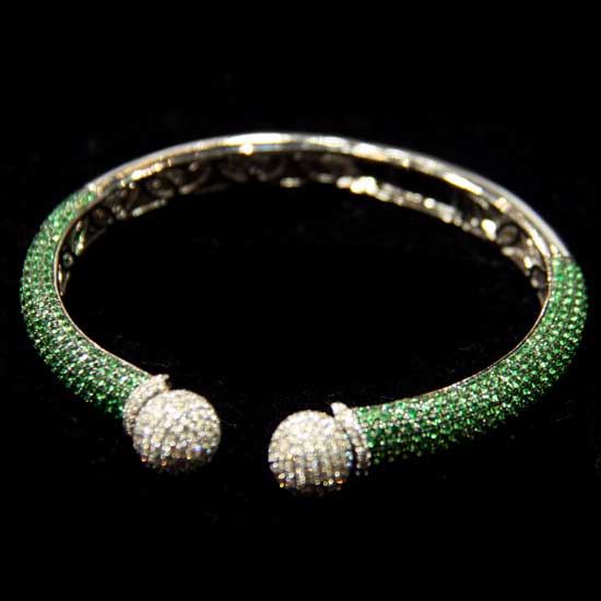 The bangle is made of 18K white gold for lasting beauty and durability. It features a thin-band design highlighted by shimmering Tsavorite garnets, adding an extra touch of style. This bangle makes a pretty way to enhance your closet.