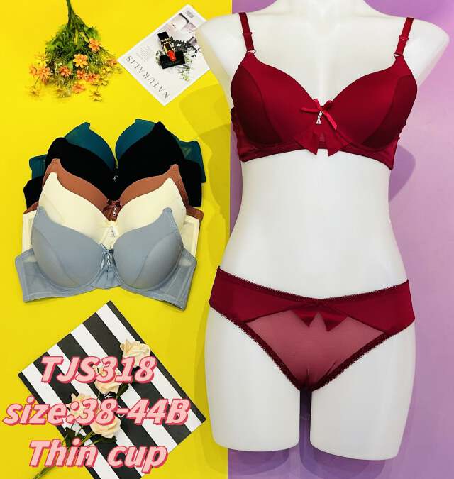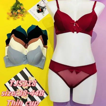 The Thin Cup Bra Set TJS318 is designed for both style and comfort, available in size range 38-44B. It features a sleek design with a charming bow detail at the center, adding a touch of femininity. The thin cup construction ensures a natural fit, making it suitable for everyday wear. Offered in a variety of colors including red, gray, beige, brown, black, and teal, this set caters to diverse fashion tastes. The lingerie set combines quality craftsmanship with aesthetic appeal, ideal for those seeking a blend of elegance and comfort in their undergarments.
