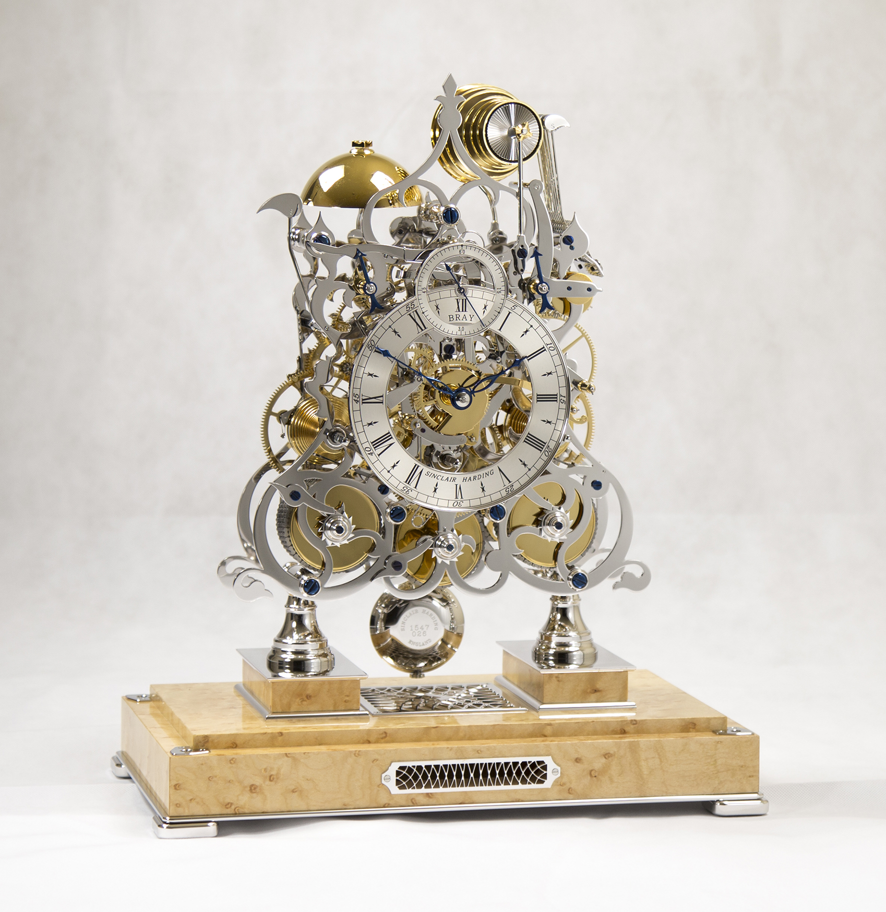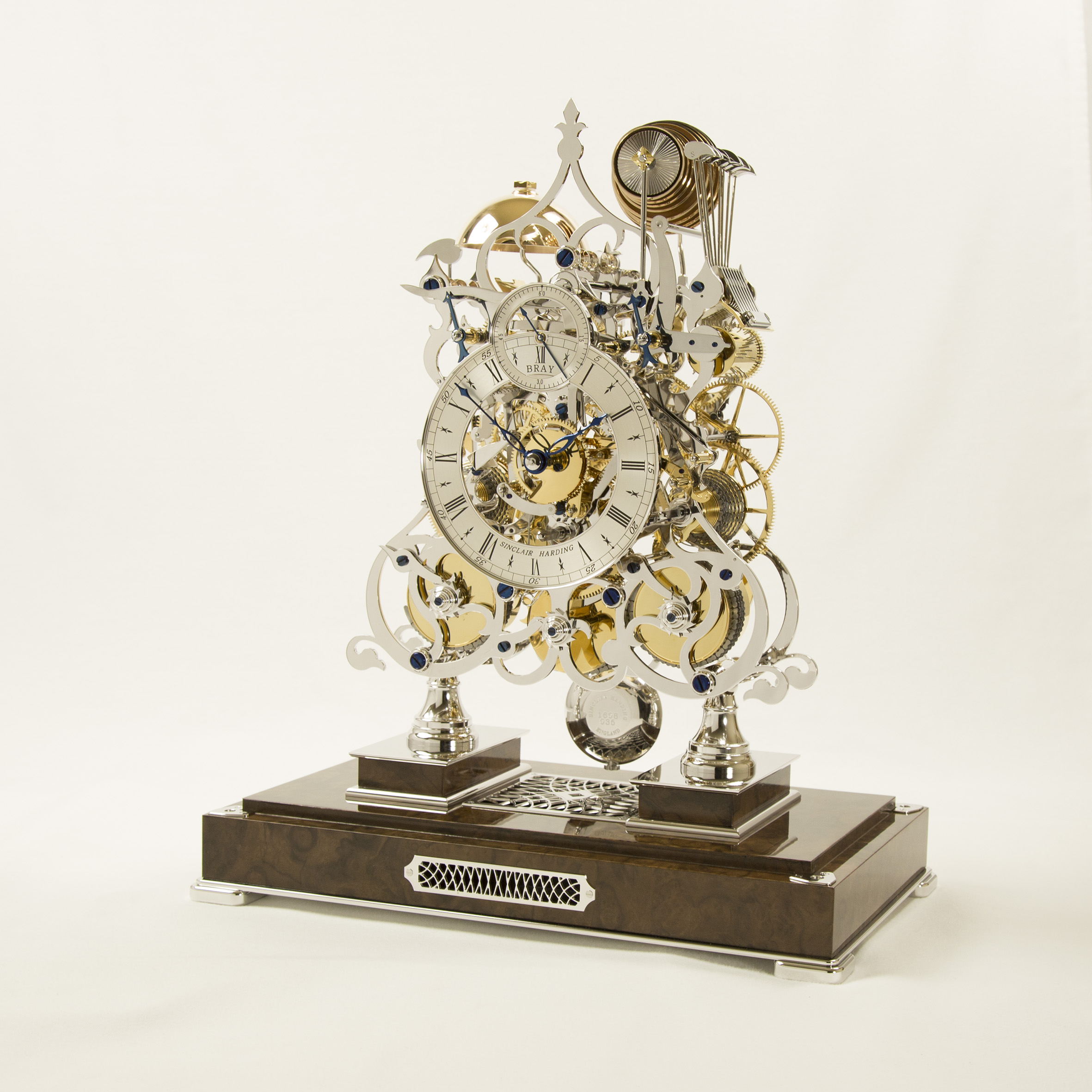 This magnificent chiming Skeleton Clock is the result of months of painstaking hand work. Each plate is individually cut out of solid brass, edge filed, papered smooth, burnished and gilded before finally being built into a finished clock. Every wheel and arbor, detent and lever has been finished by hand to give the whole mechanism the glittering aspect of a true work of art.