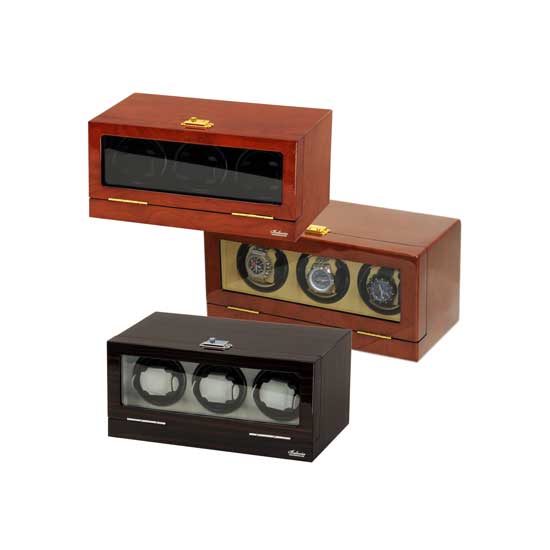 This is a three-watch winder made of ebony wood for a smooth and elegant touch. It rotates your automatic watch to set direction and set Turns Per Day (TPD) to keep it wound. It has five different TPD settings: 650, 900, 1,200, 1,500 and 1,800, with intermediate rest cycles to eliminate potential stress on watch movement. It rotates clockwise, counter-clockwise or alternates in between. The winder will repeat its cycle every day as long as it is on, without intervention.