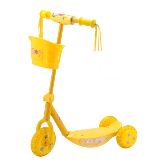This three-wheel scooter boasts an appealing design. It comes with a front basket for a kid to store delicate items. The handlebar is embellished with tassels for extra style. The scooter comes in a sturdy construction for added safety.