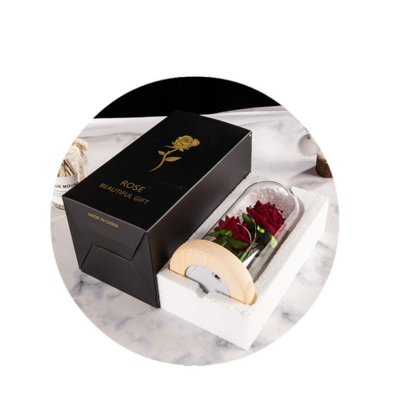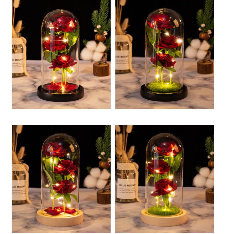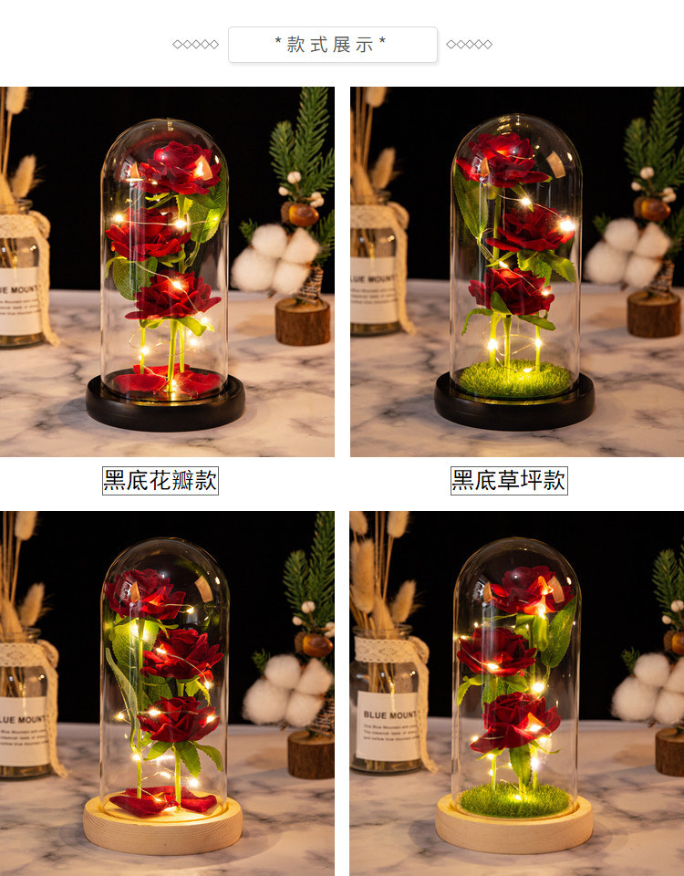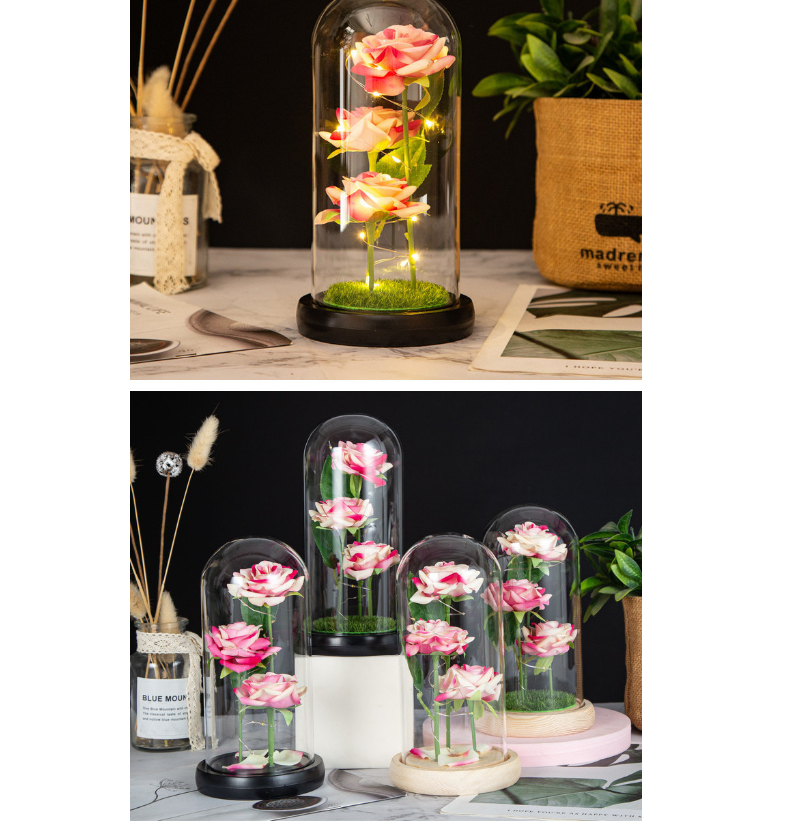 Three artificial rose glass cover ornaments Dry bouquet Artificial flowers of Mother's Day Valentine's Day creative birthday gifts for wife girlfriend atmosphere light