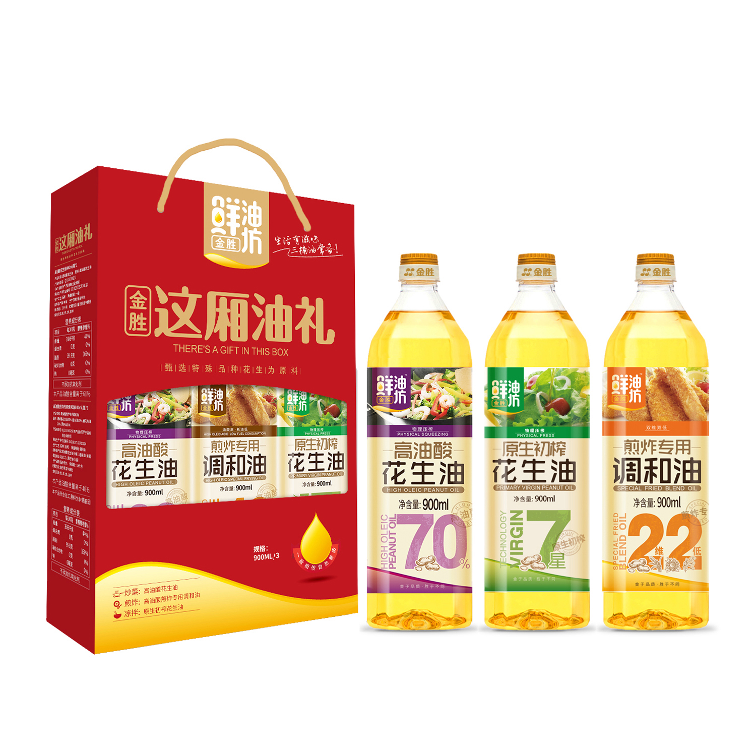 Surprise cooking enthusiasts with this premium Jinsheng oil gift box. This three-piece cooking oil set includes pressed peanut oil used as sauces, dressing or served cold, high oleic acid peanut oil for stir-fries, and frying oil blend for deep-fries. Accommodating a range of cooking needs, this set would make a practical and thoughtful gift for friends and family.