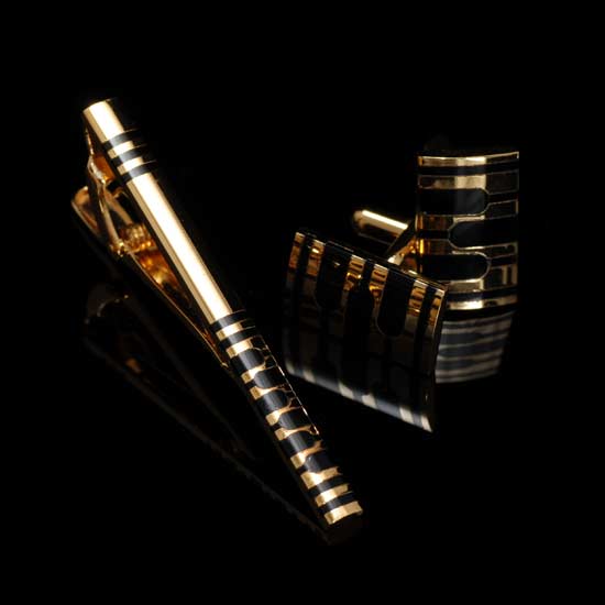 Silver tie clip & cufflink set bestows an extravagant design in golden. The black stripes add a decorative touch. This tie clip makes an excellent gift for gentlemen.