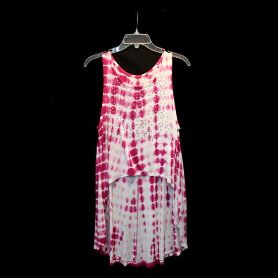This sleeveless tie-dye ladies' blouse is a fancy choice of garment for summer. The irregular hem and loose structure is comfortable and stylish. The pink patterns and water drop-like beads lends extra detail to the design.