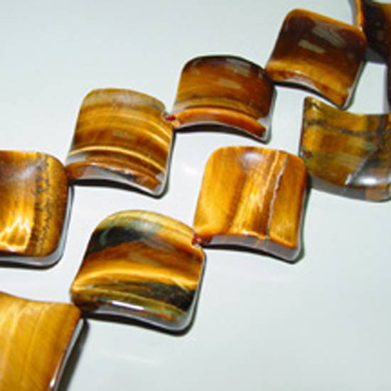 These tiger eyes beads have yellow color with natural and fine grain. They have been cut into twist square shape. Other cutting e.g. flat square, flat rectangle, star of David,, twist round, flat oval, flat barrel, hear, facet rectangle, round carven, rice and irregular are also available.