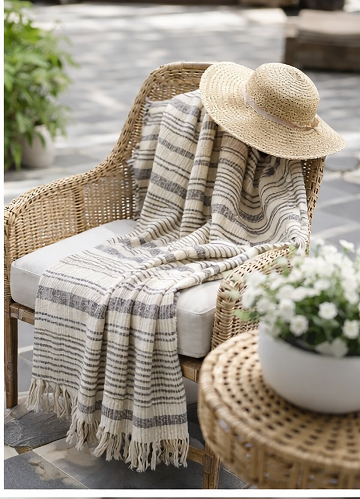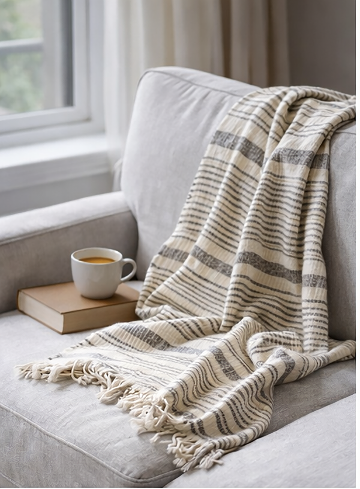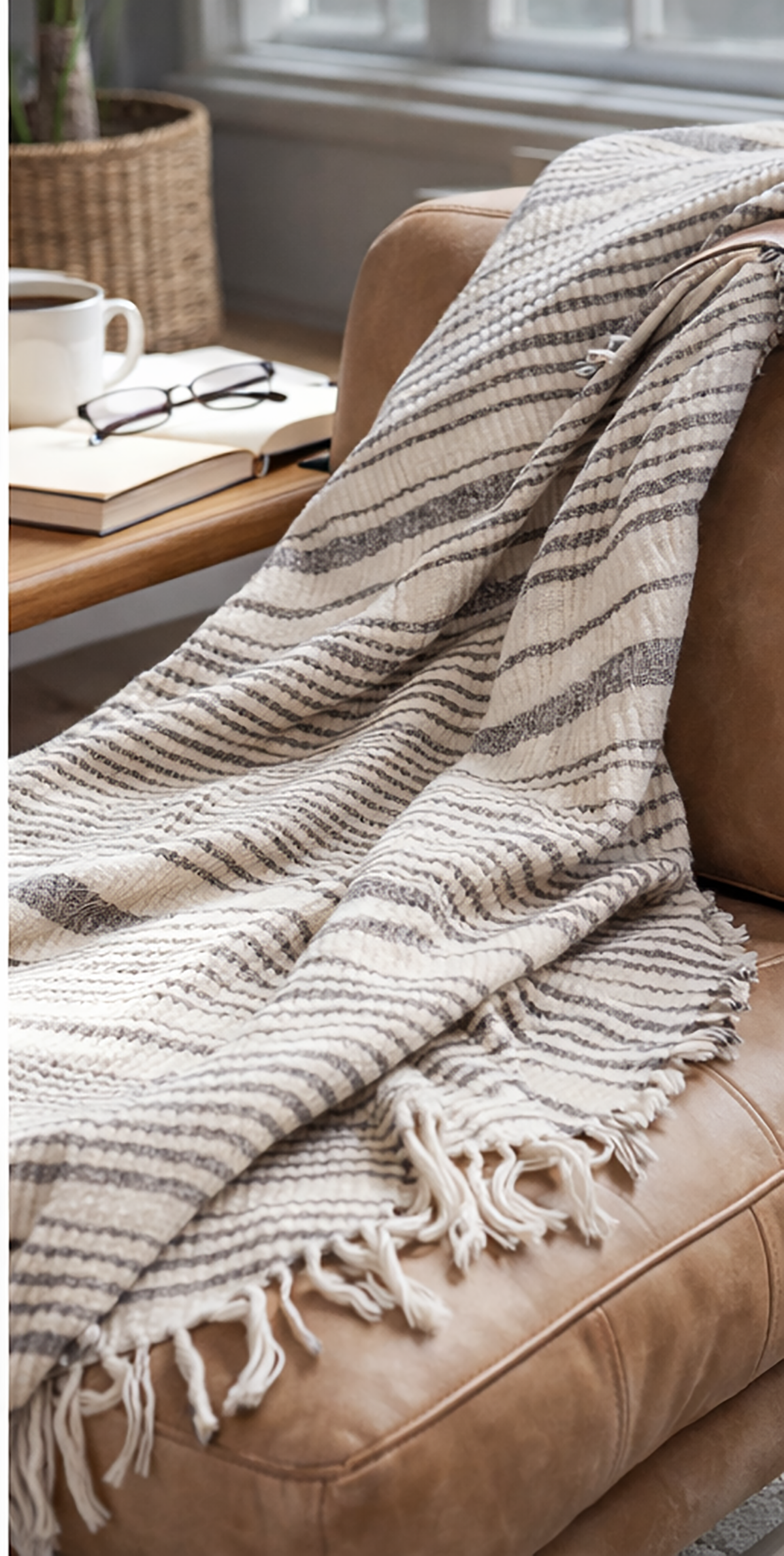 Designed for versatile functionality, it can be draped over a sofa, folded neatly at the foot of a bed, or used as a cozy wrap while reading or relaxing. Its refined finish and natural texture add warmth, elegance, and personality to any living environment.
