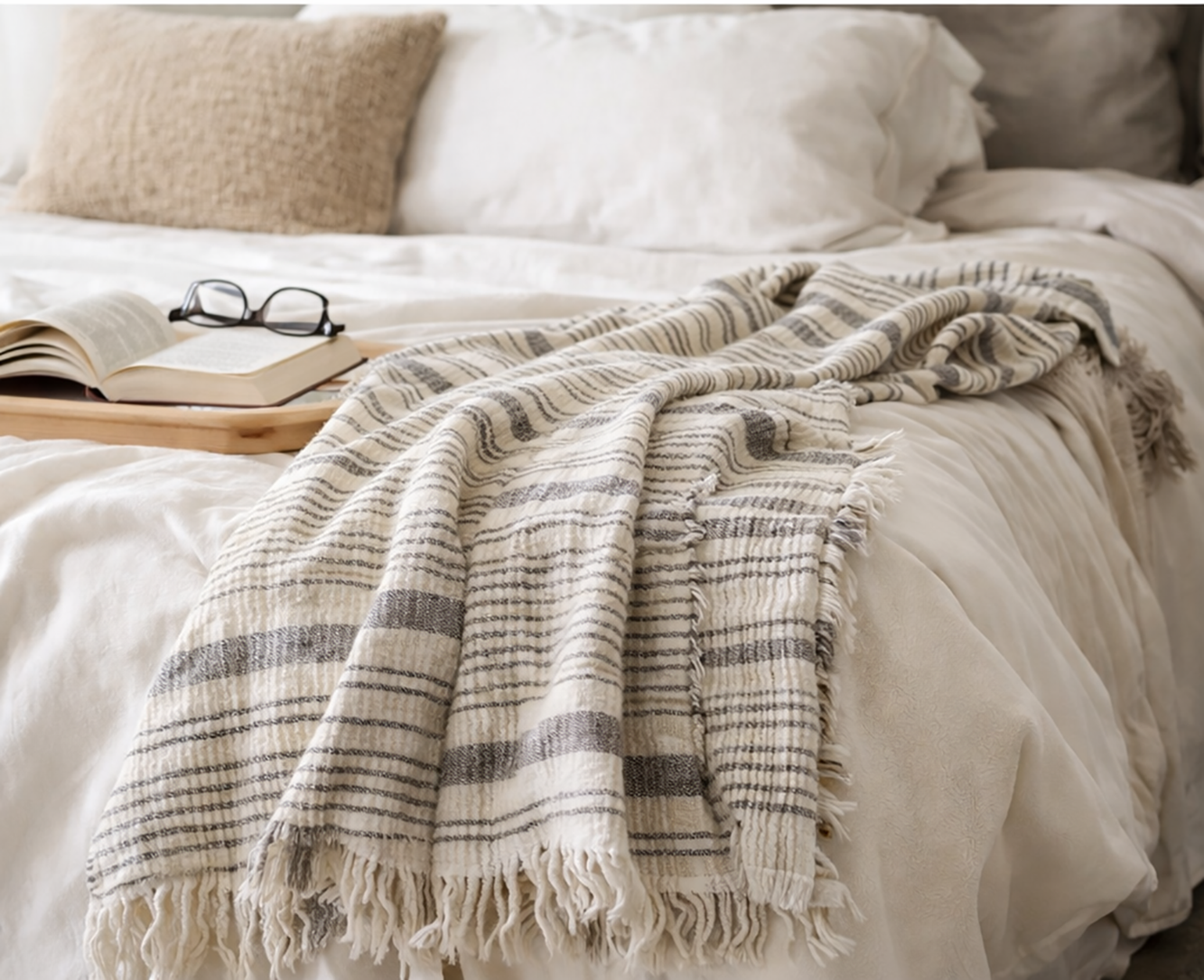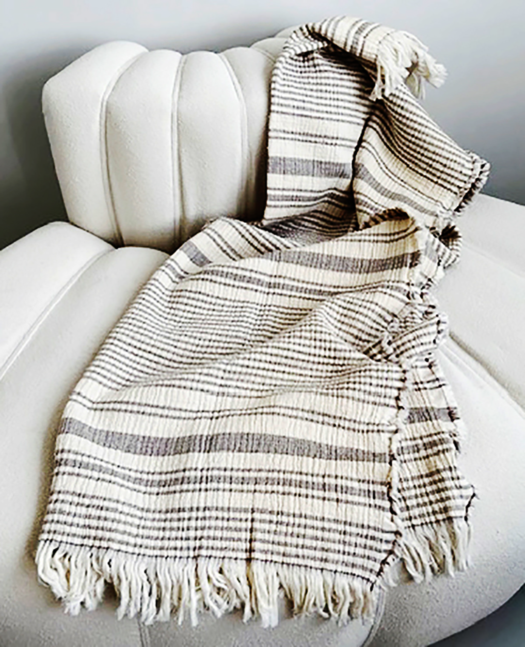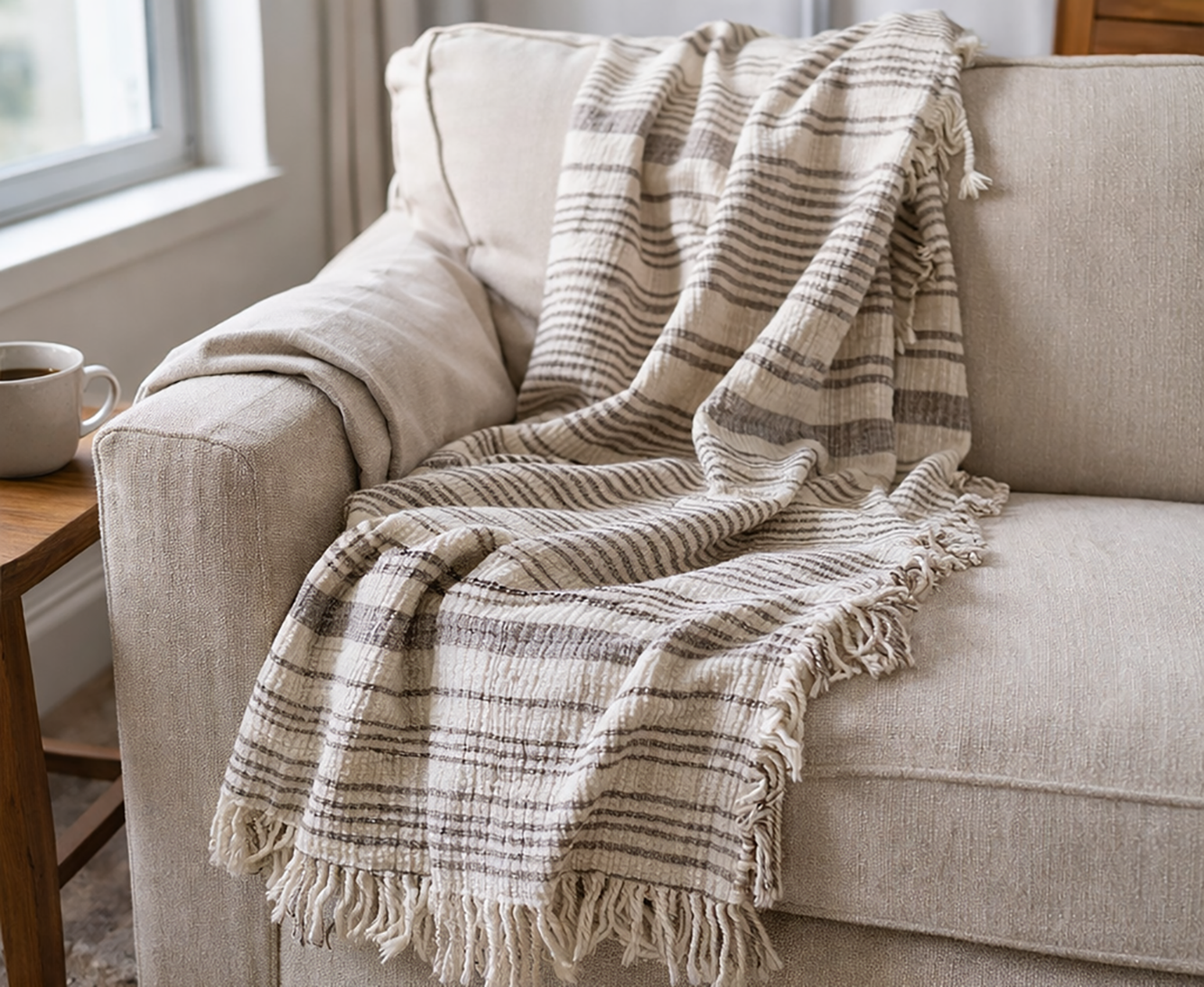 Designed for versatile functionality, it can be draped over a sofa, folded neatly at the foot of a bed, or used as a cozy wrap while reading or relaxing. Its refined finish and natural texture add warmth, elegance, and personality to any living environment.