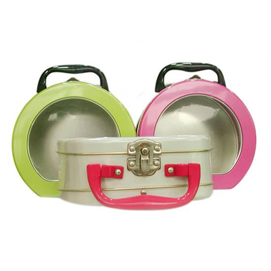 Tin container is available in different styles and colours. Plastic handle and lock are both attached at the top of each container. It has a transparent coloured cover.