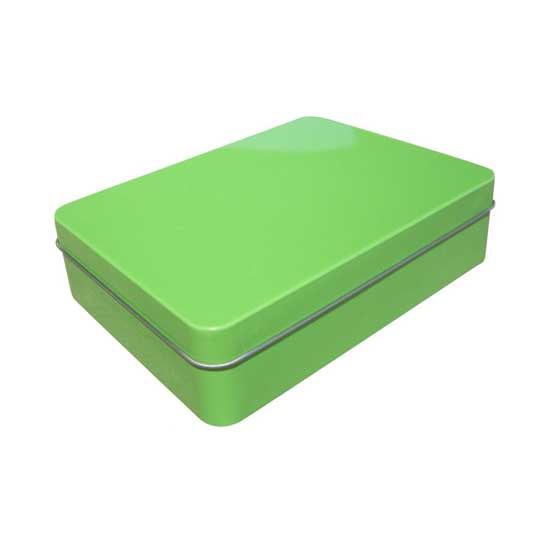 Displayed is a tin box that comes in a flat square shape. Made of high quality tin, this box is strong and moisture-free once sealed. This simple yet useful tin box is a good choice for your home.