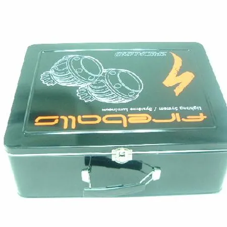 • This tin box with plastic handle & metal lock for easy carrying.