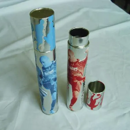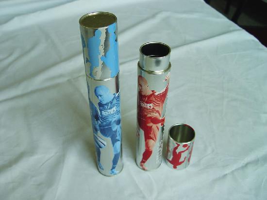 • Tall tin can in round shape & with lift off lid.