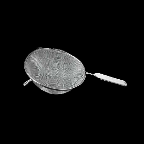 This is a tin plated strainer for domestic purposes. It features an easy-to-grip handle and a hanging hoop. This finely designed item is a practical addition to your kitchen.