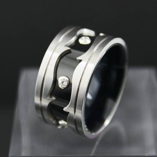 The titanium and steel ring boasts a tough construction with engraved patterns. The CZ setting adds a shimmering touch. This titanium and steel ring makes a nice gift for men.