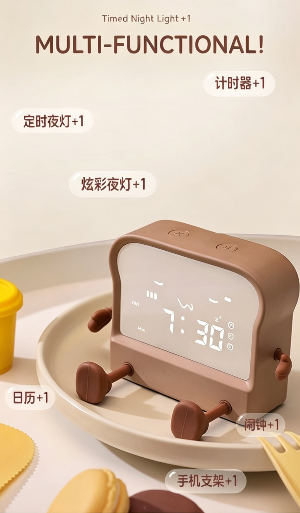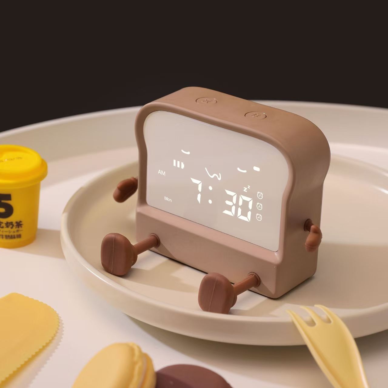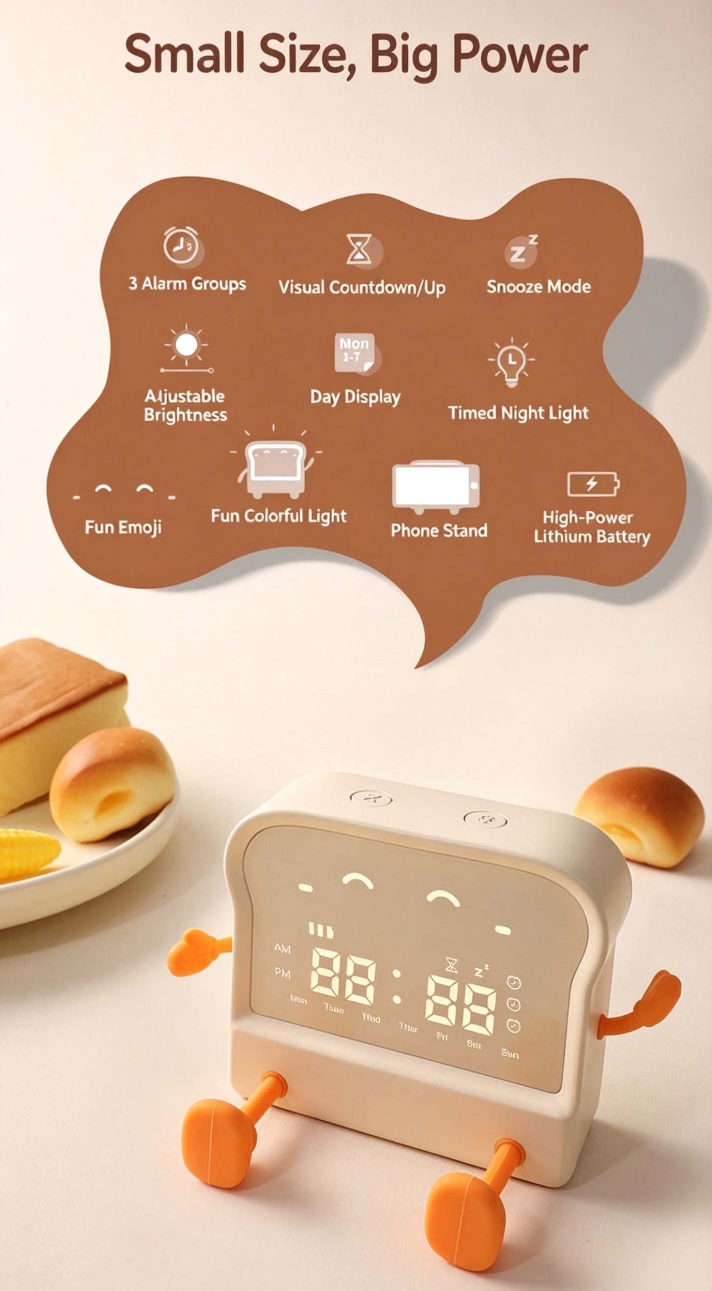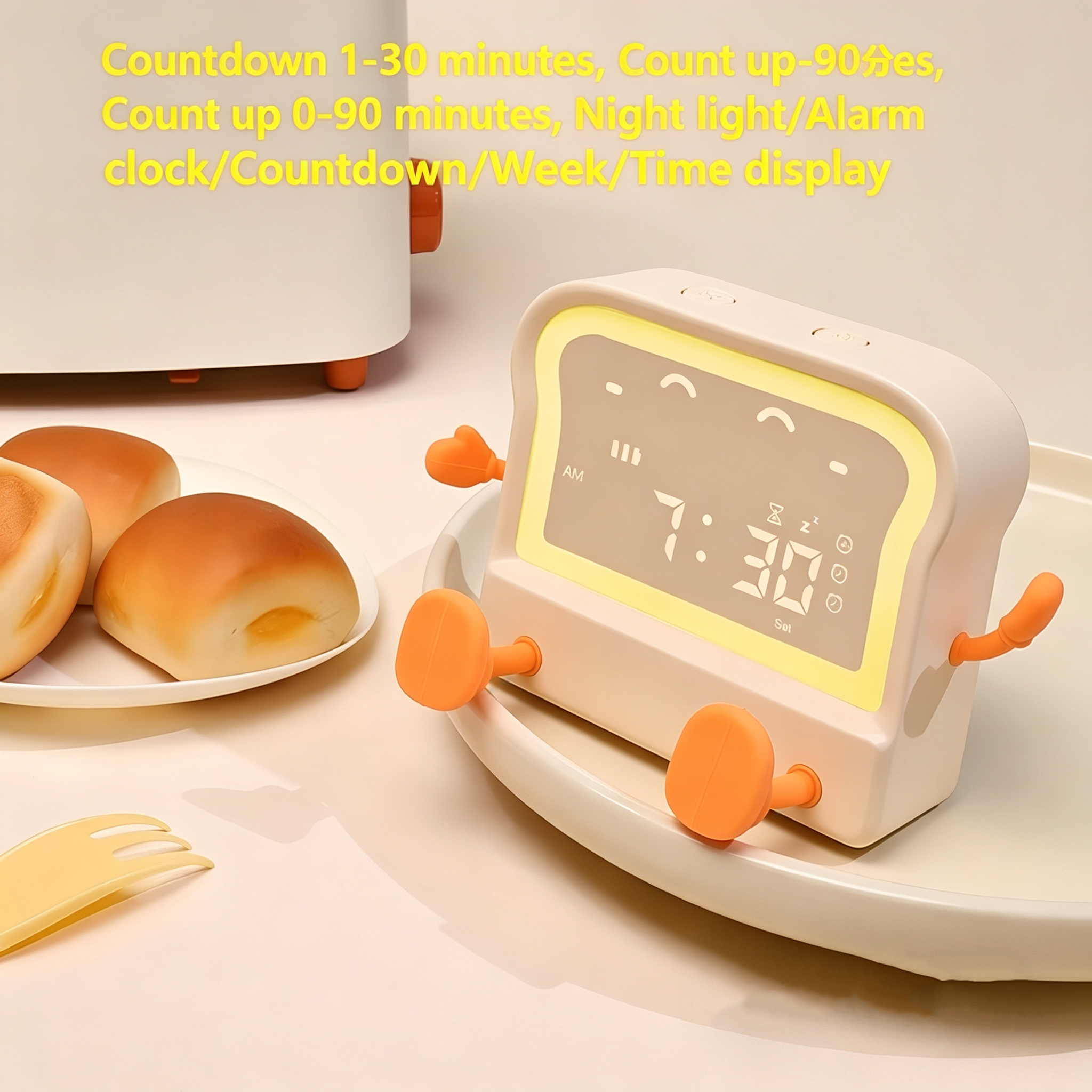 Meet your new daily companion – the adorable toast-shaped alarm clock! This multi-functional device combines a clock, alarm, timer, night light, and phone stand into one cute, compact package. Perfect for students, office workers, and anyone who loves a touch of whimsy in their daily routine.