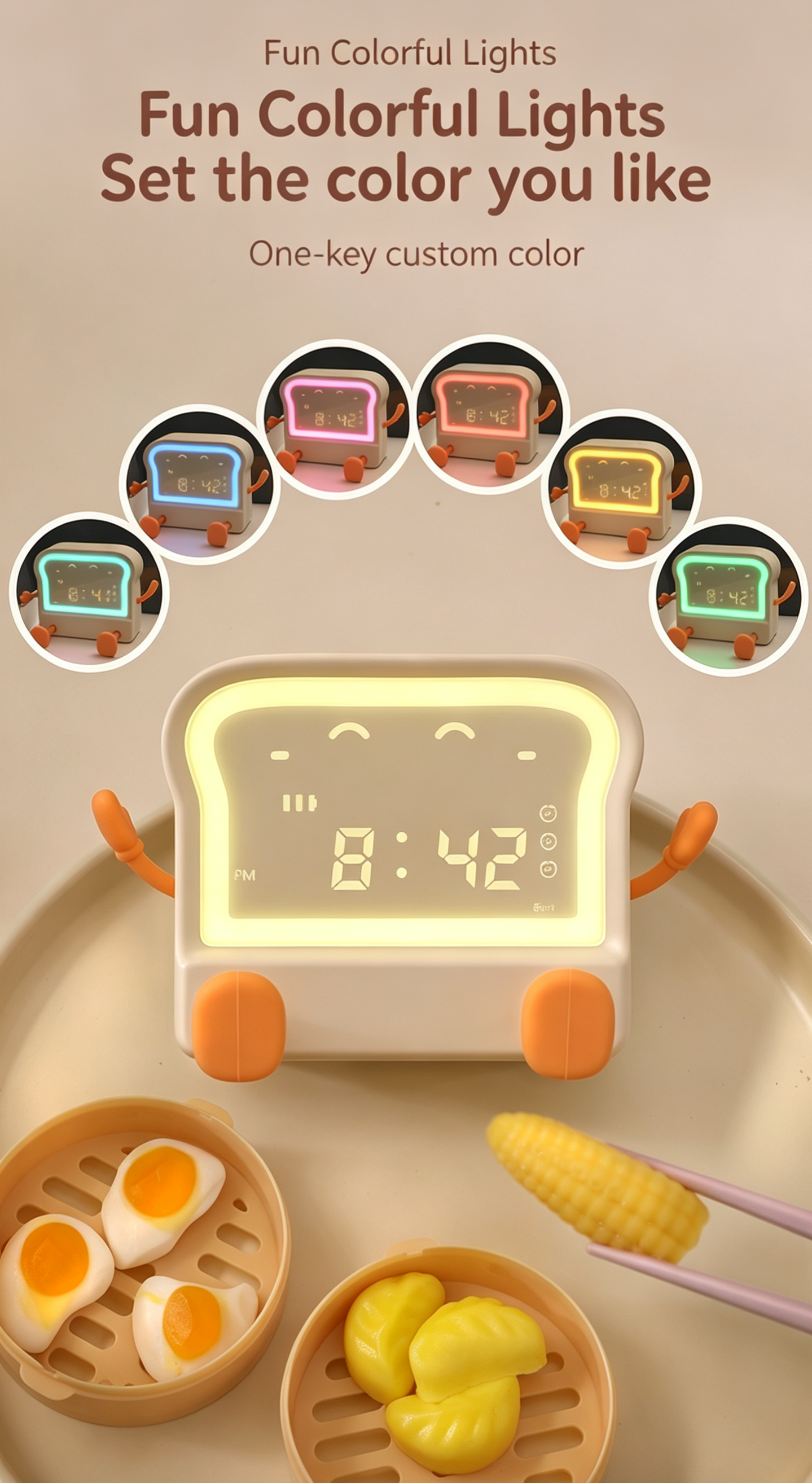 Toast PVC Alarm Clock with 7-Color Night Light, Kitchen Timer, Phone Stand, Rechargeable Clock