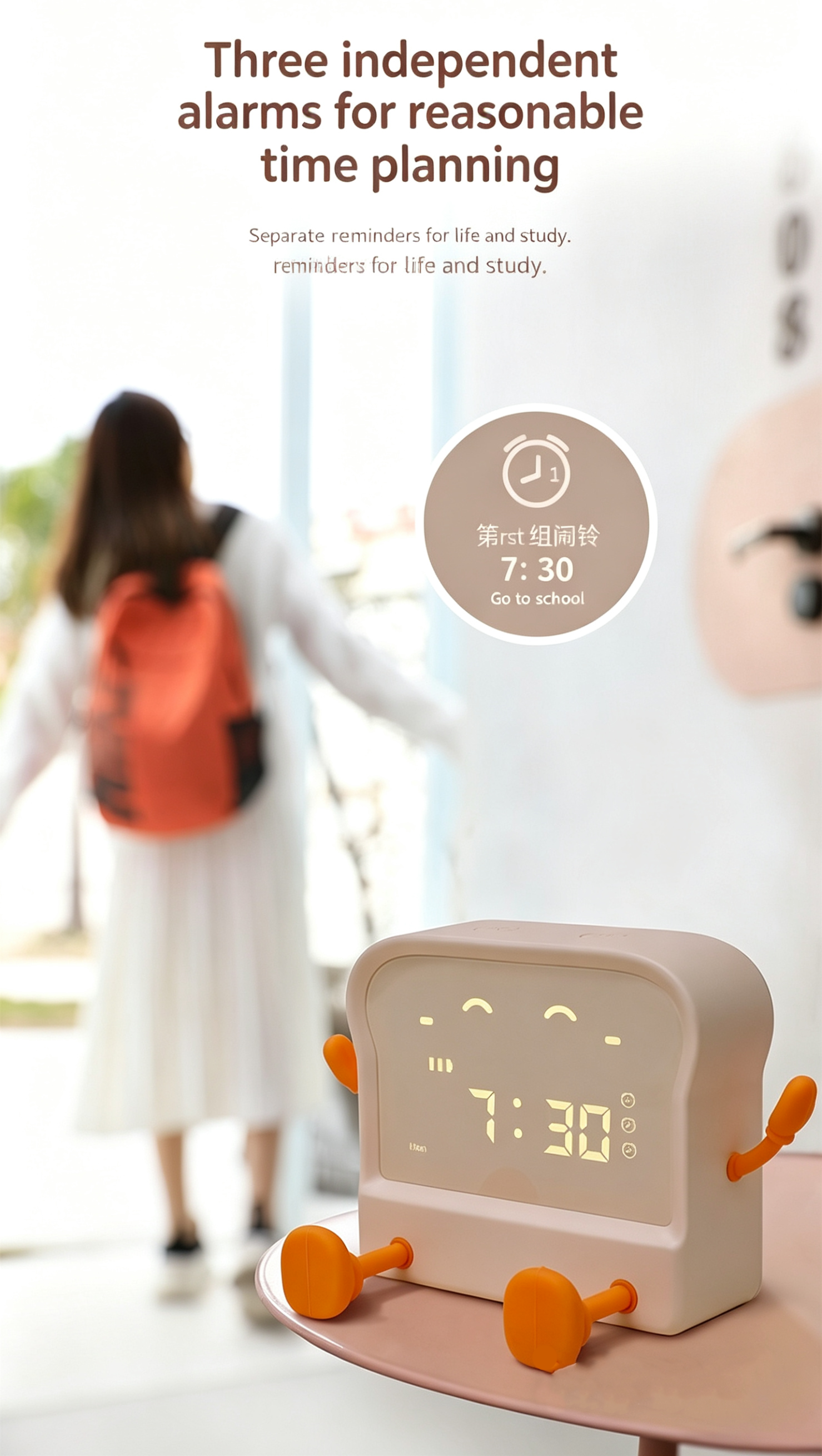Set up to 3 separate alarms for school, work, or bedtime. The 5-minute snooze function lets you wake up gently without the rush.