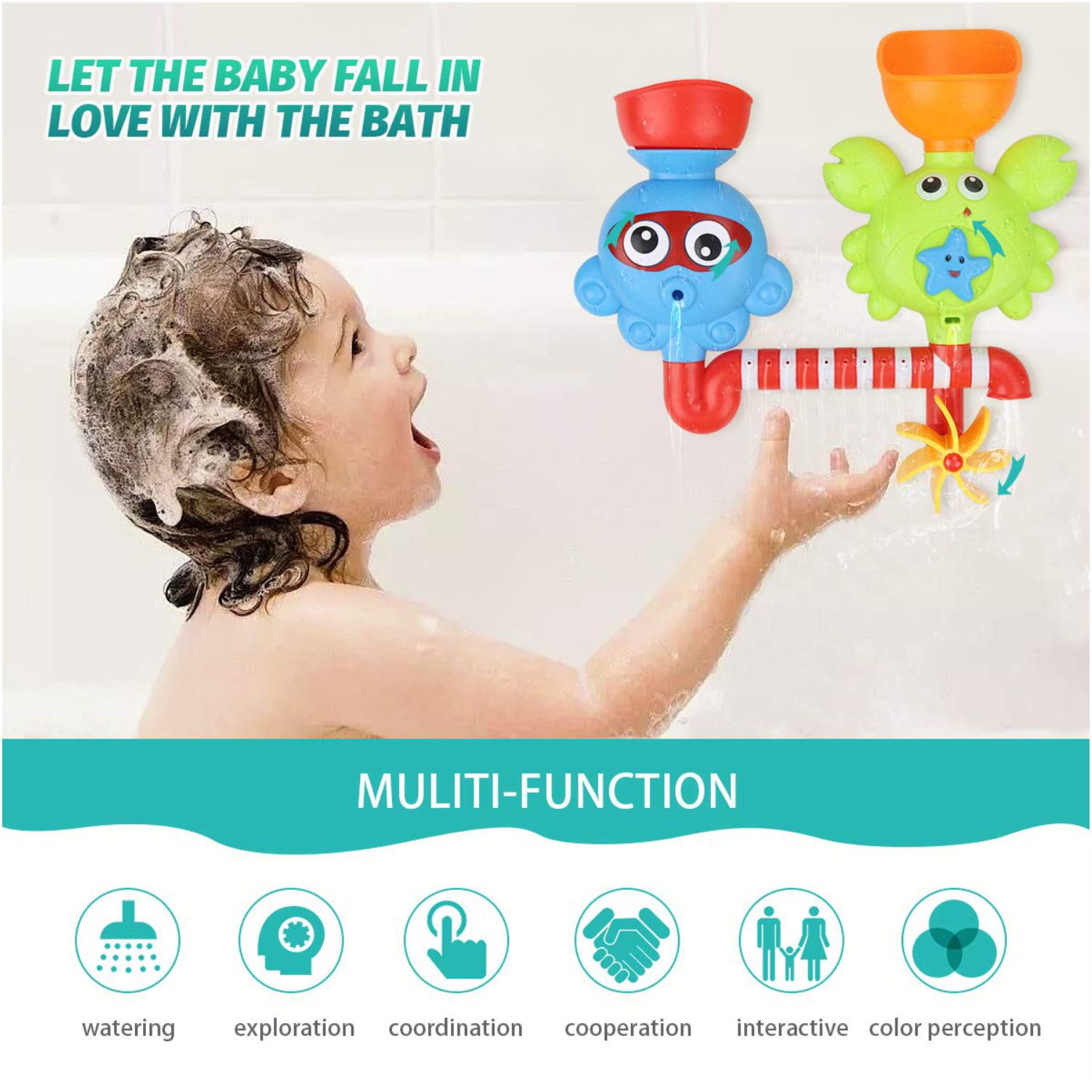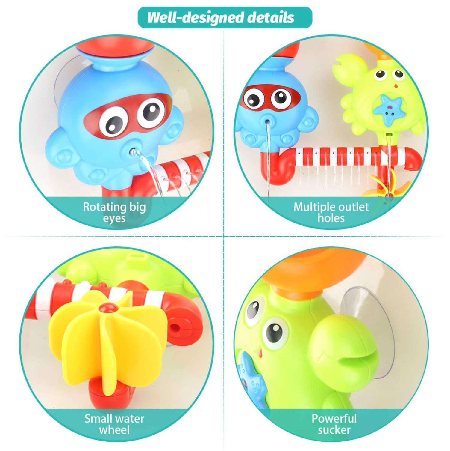 DEVELOP HAND-EYE COORDINATION: The Bath Toy is also a great educational gift for toddlers, to help in the development of mental and coordination abilities of babies. Children can learn simple knowledge of mechanical movement through filling the bathtub toys with two cups and showering to rotate the toy eyes, driving totary gear, propellering and creating waterfall.