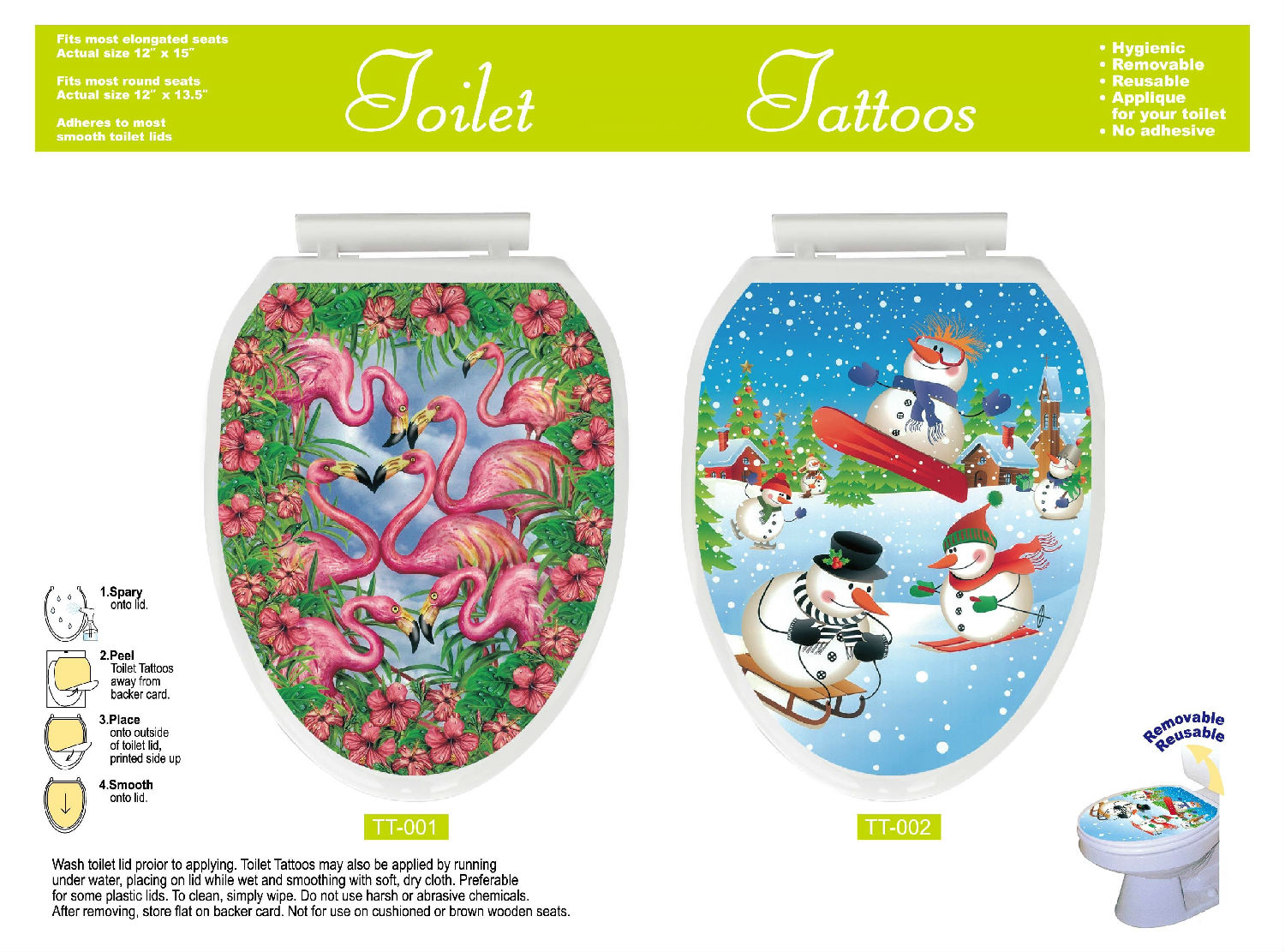 • Easy to place on lid, It with out any glue, it can stick on the toilet lid by static.