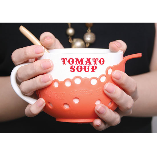 This tomato soup cup features an elegant white body with a bright red heat-resistant sleeve. The soup cup is designed with an ear-shaped handle for a comfortable grip. The high-quality soup cup is durable and easy to clean.