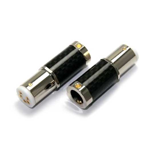Displayed is a tonearm connector that comes with a PTFE insulator. Featuring a brass body with nickel plating, this connector has a black carbon fiber shell with brass pins. This high-end connector is a good choice for audio-visual connection.