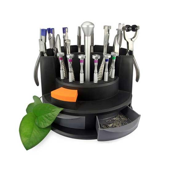 This tool kit comes with 13 pliers, 6 screwdrivers and a tool stand. The pliers and screwdrivers are designed with different slots for added utility and functionality. The tool stand boasts a sophisticated structure with two drawers for storing screws, nose pads and other small fasteners.