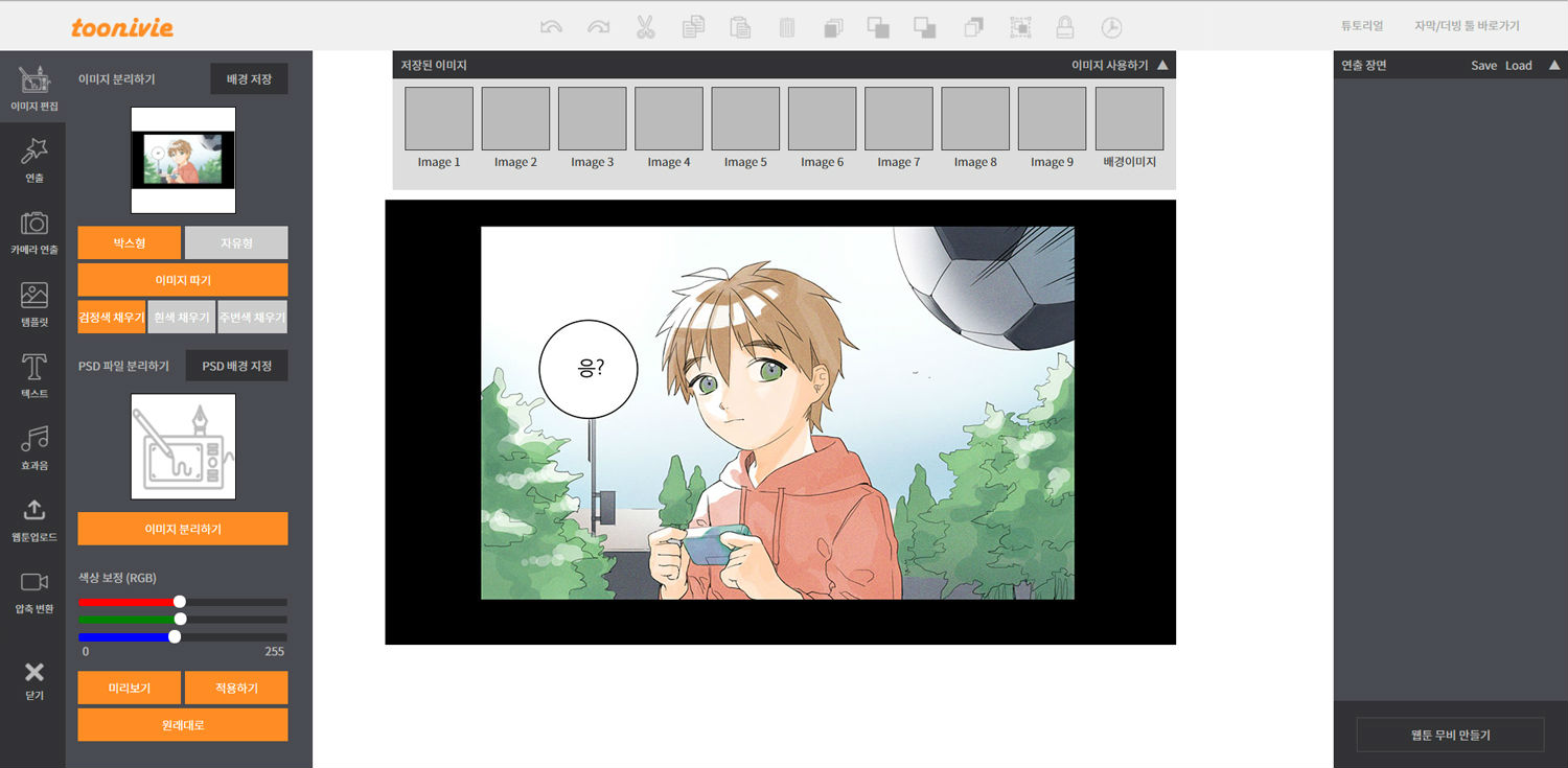 we had great authoring tool that webtoon/ cartoon turn into webtoon movie conveniently. The authoring tool techniques provide function of converting static images to moving images. So, authoring tool techniques offer image seperation, dimensional effect, camera moving, automatic colorize. In addition, we are selling webtoon movie artwork that made by our authoring tool.