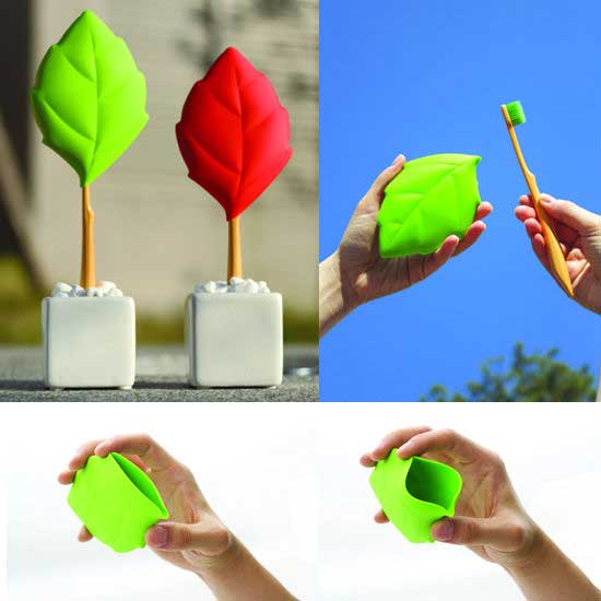This novel toothbrush and cup set features the look of a leave with a tiny twig. The cup is made of safe silicone material while the toothbrush is made of biodegradable PLA plastic. The brightly colored toothbrush and cup set also makes a great decoration for your bathroom.