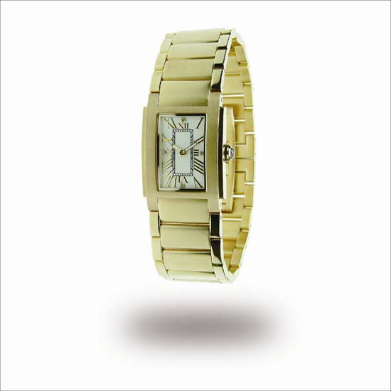 This top-grade ladies' watch exudes a ritzy air with its brilliant ion gold plating. It comes with a rectangular etched dial with antique Roman time markers. The watch employs Swiss components to ensure efficient operation.