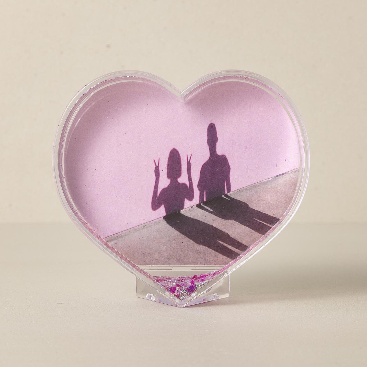 Glitter photo frame in heart shape that is perfect for displaying your favorite photo, filled with water and shimmering glitter inside.