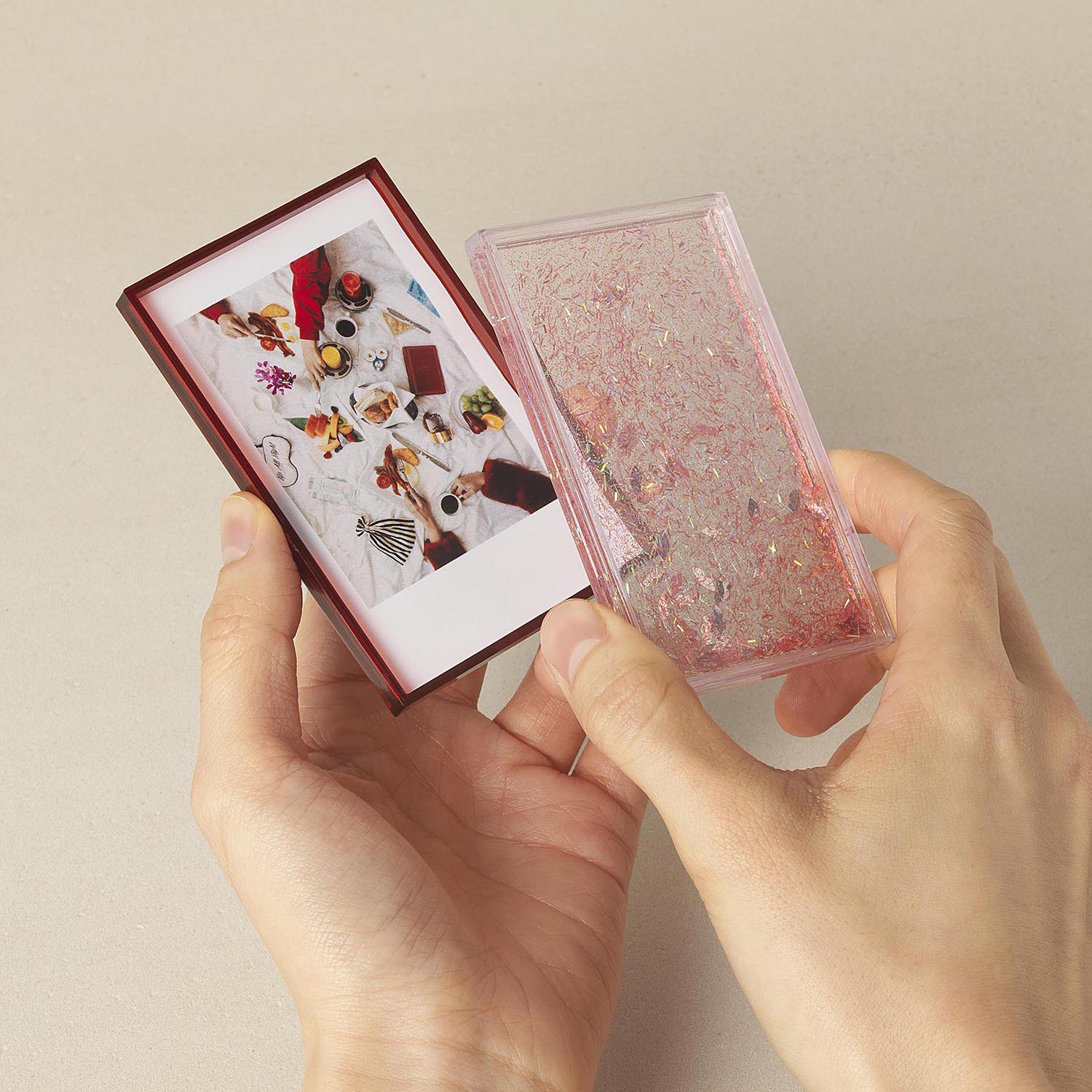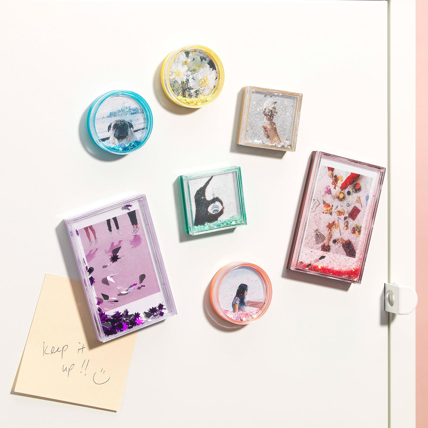 Instax Mini glitter frame magnet filled with water and shimmering glitter inside, that is ideal for displaying your favorite Instax Mini shot and decorating fridge or any other metal surface.