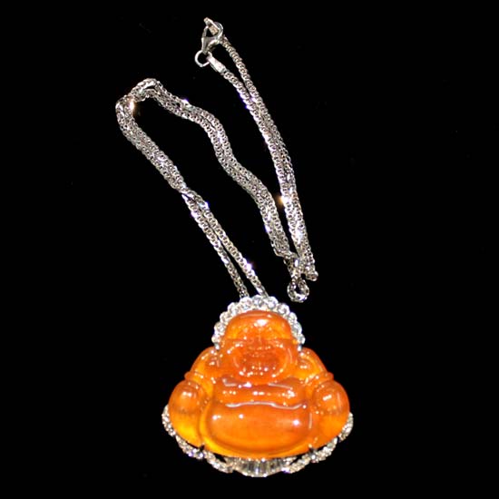 The Buddha pendant is made of quality topaz to give out an attractive yellow glow. The Buddha carving features a kind expression with delicate craftsmanship. Loose diamonds are added on the edges to make the pendant look more glamorous.