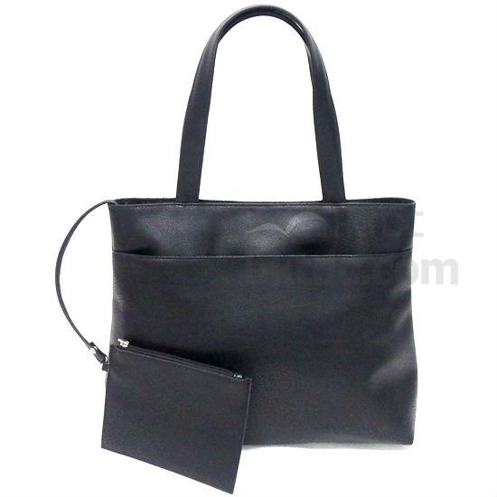 Provide organized storage for your personal items with this tote bag. It has a rectangular main compartment, a slip pocket in the front and a hanging zip pouch to provide lots of space for storage. This tote bag is made of PVC with a leather look and has handles on top for convenient carrying.