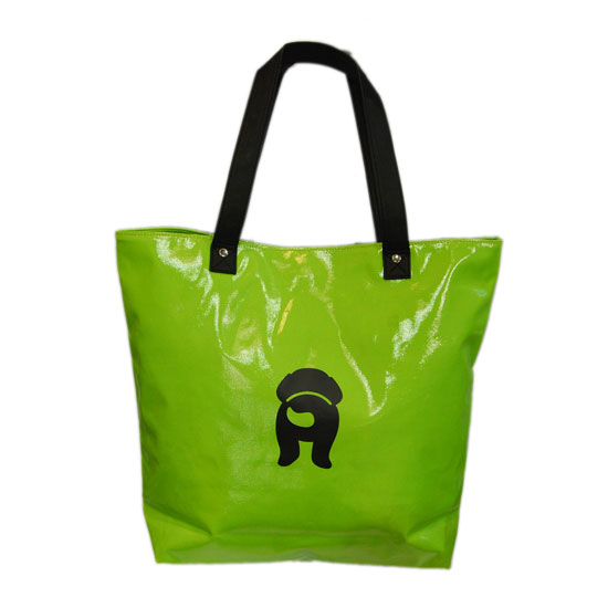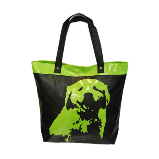 This stylish two-toned tote bag features a cute dog motif on the front. The quality tote bag is made of quality canvas and treated with glossy PVC coating. The roomy handbag is great for shopping and travel.