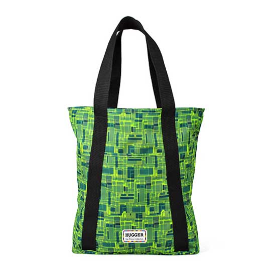 This rectangular tote bag features a green camouflage pattern with black shoulder straps. It is designed with a divider in the compartment for organized storage. This casual, durable bag is great for many daily activities.