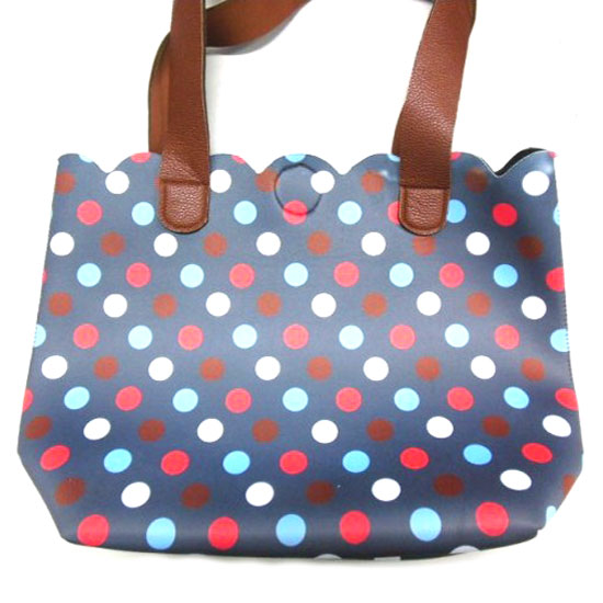 This is a tote bag coming with dotted patterns. It features durable handles to lift heavy objects. It is made with exquisite craftsmanship for long lasting use.