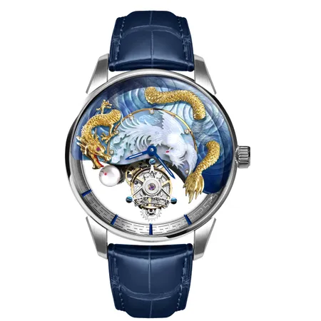 Introduce a sumptuously gorgeous addition to your timepiece collection with this tourbillon watch. Meticulously crafted with scrupulous care, it captured the perfect harmony of yin and yang through a pair of mythological creatures. At the heart of the dial marks a pellucid phoenix soaring freely under the sunset to echo with the picturesque dragon that is sailing through the ocean. Masterly rendered with a dome-shaped sapphire glass, it allows you to appreciate the horology of the suspended tourbillion motor at any angles.