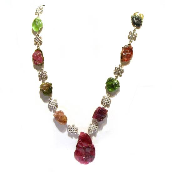 This necklace comprise multi-coloured tourmaline beads with beautiful cavings. This necklace also include Chinese knot ornaments to enhance the traditional taste of oriental style design.