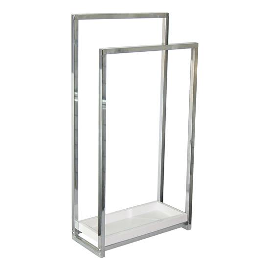 This is a towel stand suitable for use in the bathroom. The towel stand is made of plasticand is chromium plated to give a shinny appearance.
