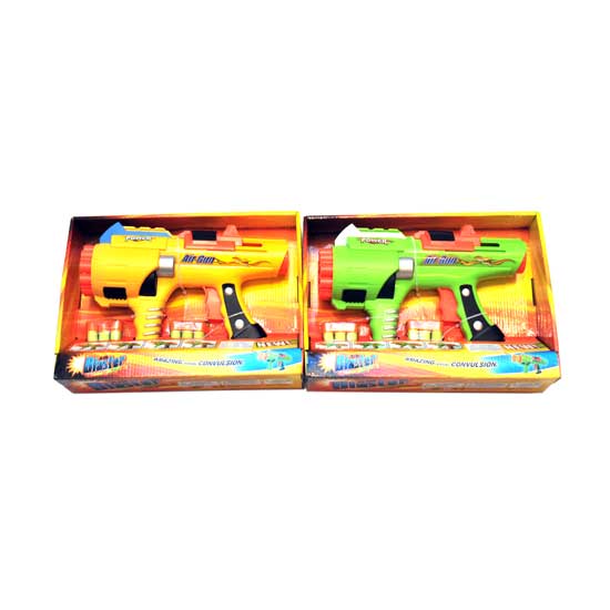 This pictured toy air gun is available in orange and green. Simply press the trigger, and it will then shoot a bullet out of the barrel. This highlighted toy air gun offers hours of fun.