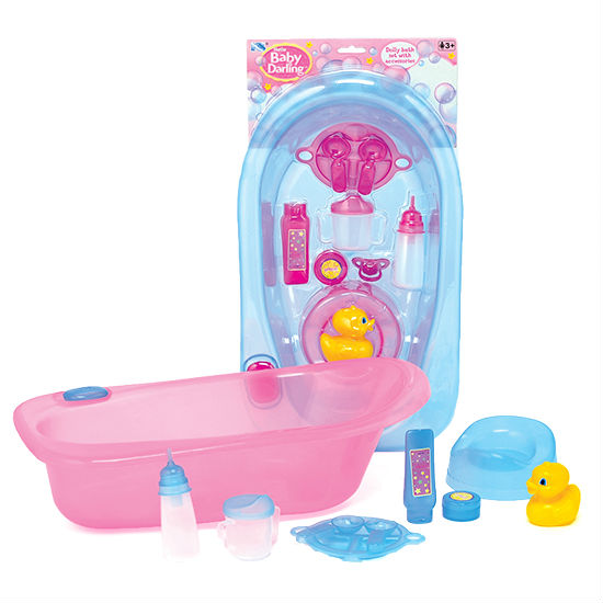 Kids will enjoy pretend bathing fun with their toy dolls with this toy set. The plastic bath tub comes with many accessories like bath duck, soap, shampoo, stool and more. The translucent construction in soft colorings offers added visual appeal.
