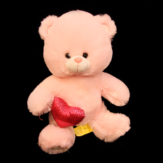 This lovely toy bear is covered with soft and dense pink plush. It is vividly crafted with a smiling face and bright round eyes. The toy bear holds a glittering red heart in its right hand for added appeal.