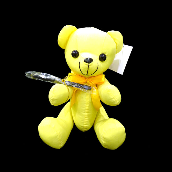 This is a toy bear that comes in a bright yellow color. Made of cotton, this toy bear is soft and comfortable to hold. The legs and arms can be bended for fun play.