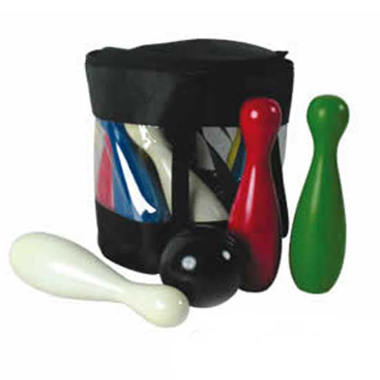 This toy bowling set includes several colorful pins and a small-sized ball. This great bowling set is suitable for playing both indoors and outdoors. It comes with a transparent bag for easy storage and portability.